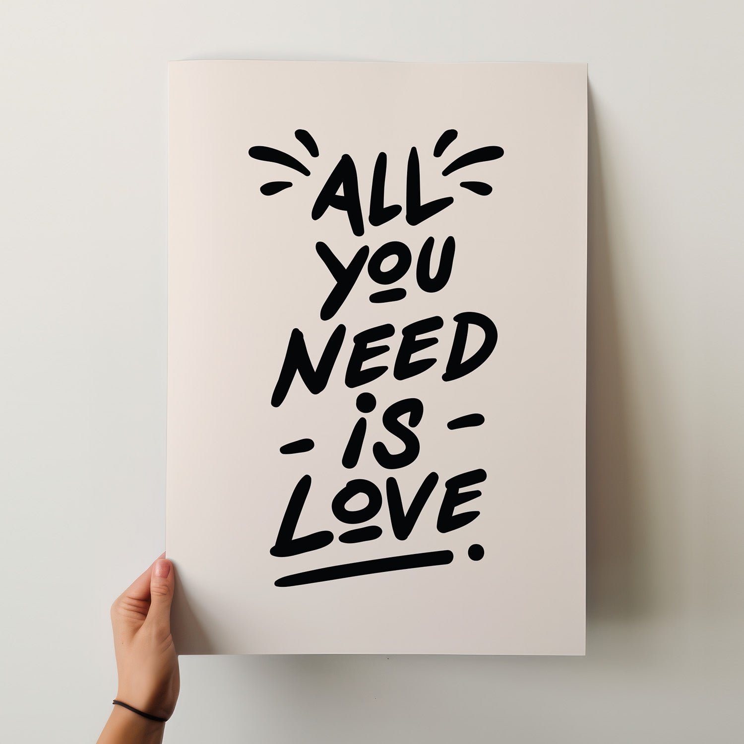 Embrace the timeless message of love with this beautifully rendered 'All You Need Is Love' print. Its bold yet playful hand-lettering, set against a warm, neutral background, brings a cheerful and uplifting vibe to any room. This piece is perfect for adding a touch of soul and a gentle reminder of what truly matters to your living space, bedroom, or even a cozy reading nook.