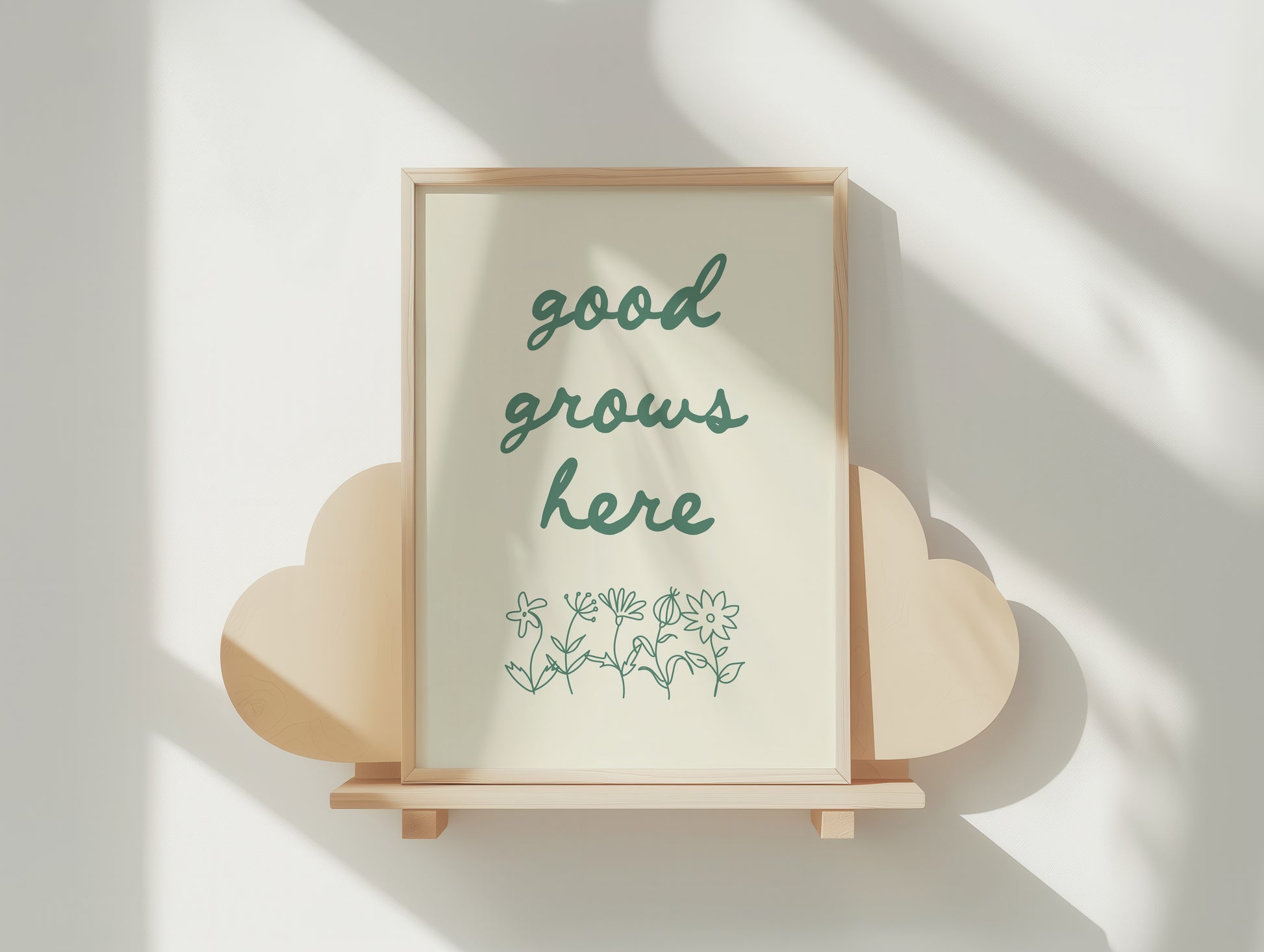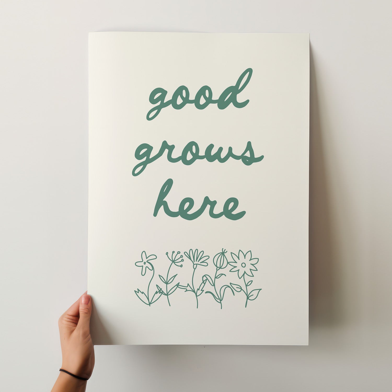 Cultivate a sense of warmth and optimism in your space with our "Good Grows Here" art print. Featuring softly hand-lettered sage green script paired with delicate botanical line art, this piece is designed to infuse your home with gentle encouragement and a touch of organic serenity. It’s a personal reminder to foster positivity, celebrate growth, and cherish the good things right where you are.