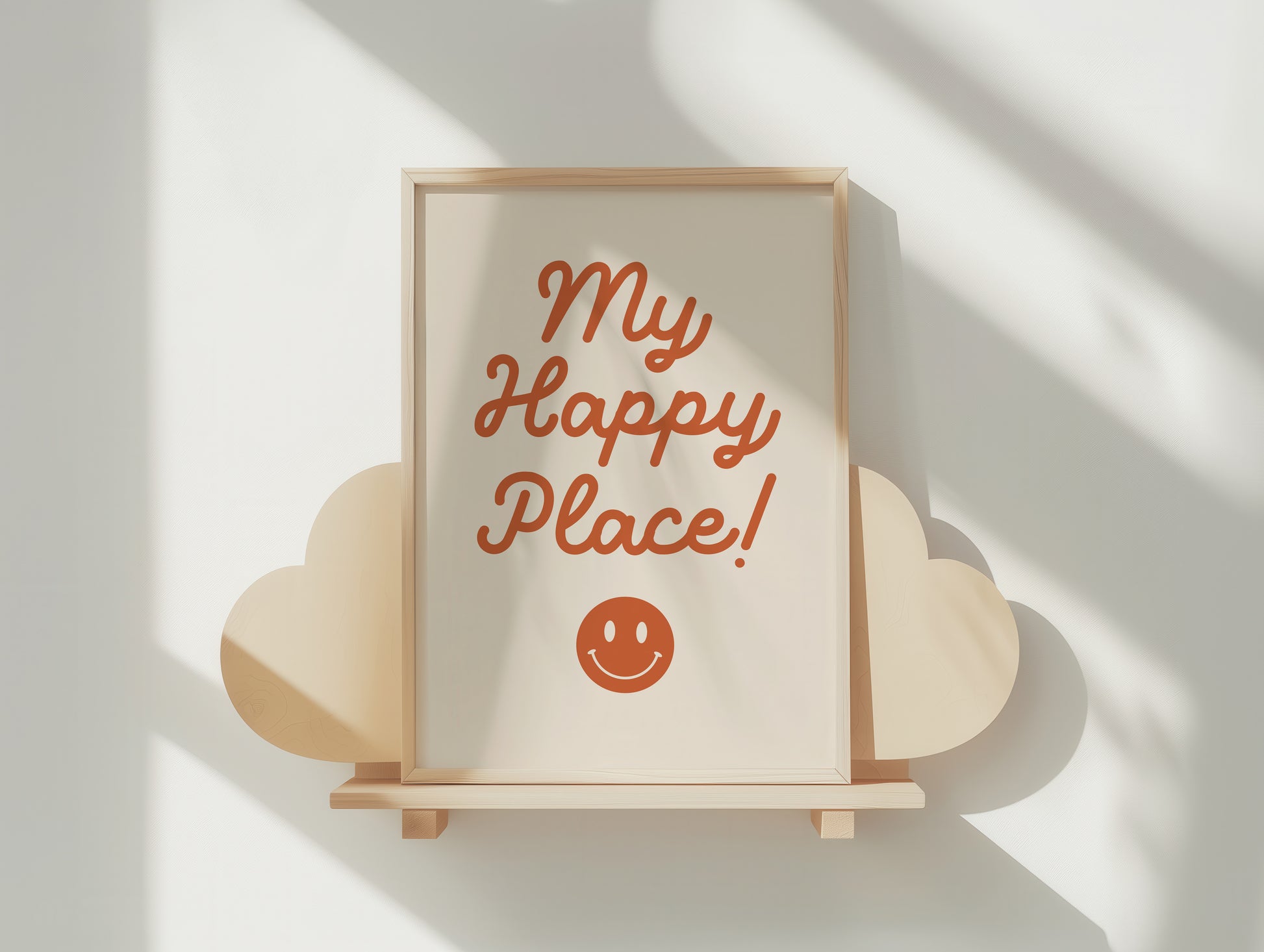 Transform any room into your personal sanctuary with our 'My Happy Place' art print. Featuring a warm, retro terracotta script against a soft cream background, this poster, adorned with a sweet little smiley face, is designed to evoke a sense of pure joy and comfort. It's more than just decor; it's a daily reminder to cherish your happy moments and spaces.
