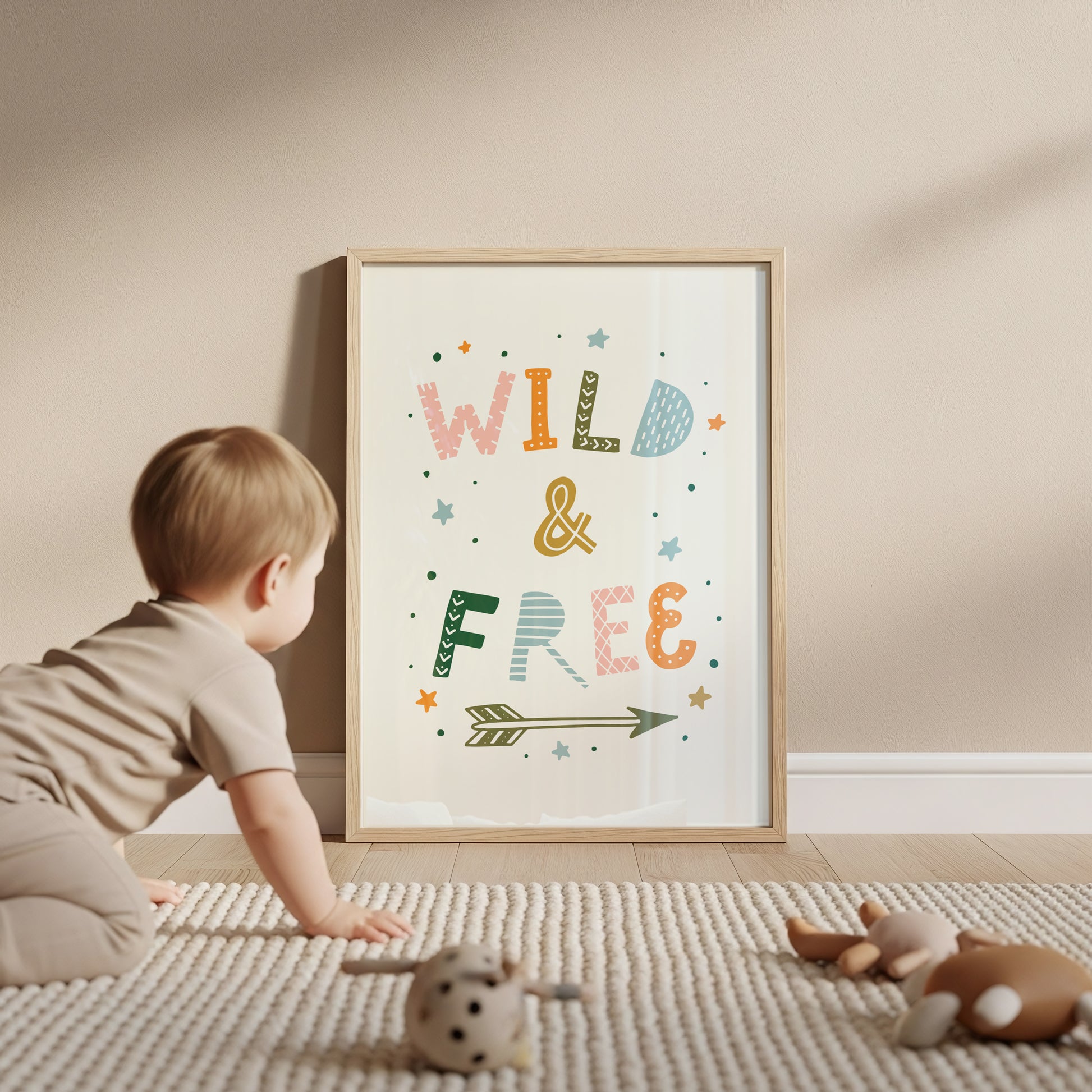 Wild & Free Boho Nursery Art Print - Hand-Lettered Whimsical Poster in Your Choice of Size